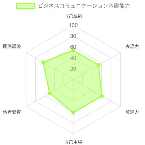 - 全24問の質問項目の結果から、「自己統制」「表現力」「解読力」「自己主張」「他者受容」「関係調整」の6スキルに対して、それぞれ7段階のスキル特典をつけて診断します。